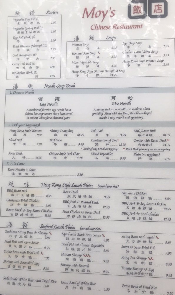 Moy’s Restaurant offers a wide variety of Chinese dishes with options for delivery, takeout, and reservations. The menu includes flavorful starters like BBQ Roast Pork and Fried Wontons, as well as hearty Bowl of Noodle Soups like BBQ Roast Pork Noodle Soup and Fish Ball Noodle Soup. Customers rave about the delicious food and friendly service, with one reviewer praising the owner, Mrs. Moy, for treating guests like family. The cozy atmosphere adds to the overall dining experience, making it a go-to spot for tasty Chinese food in Columbus. Don't miss out on the authentic flavors and generous portions at Moy’s Restaurant.